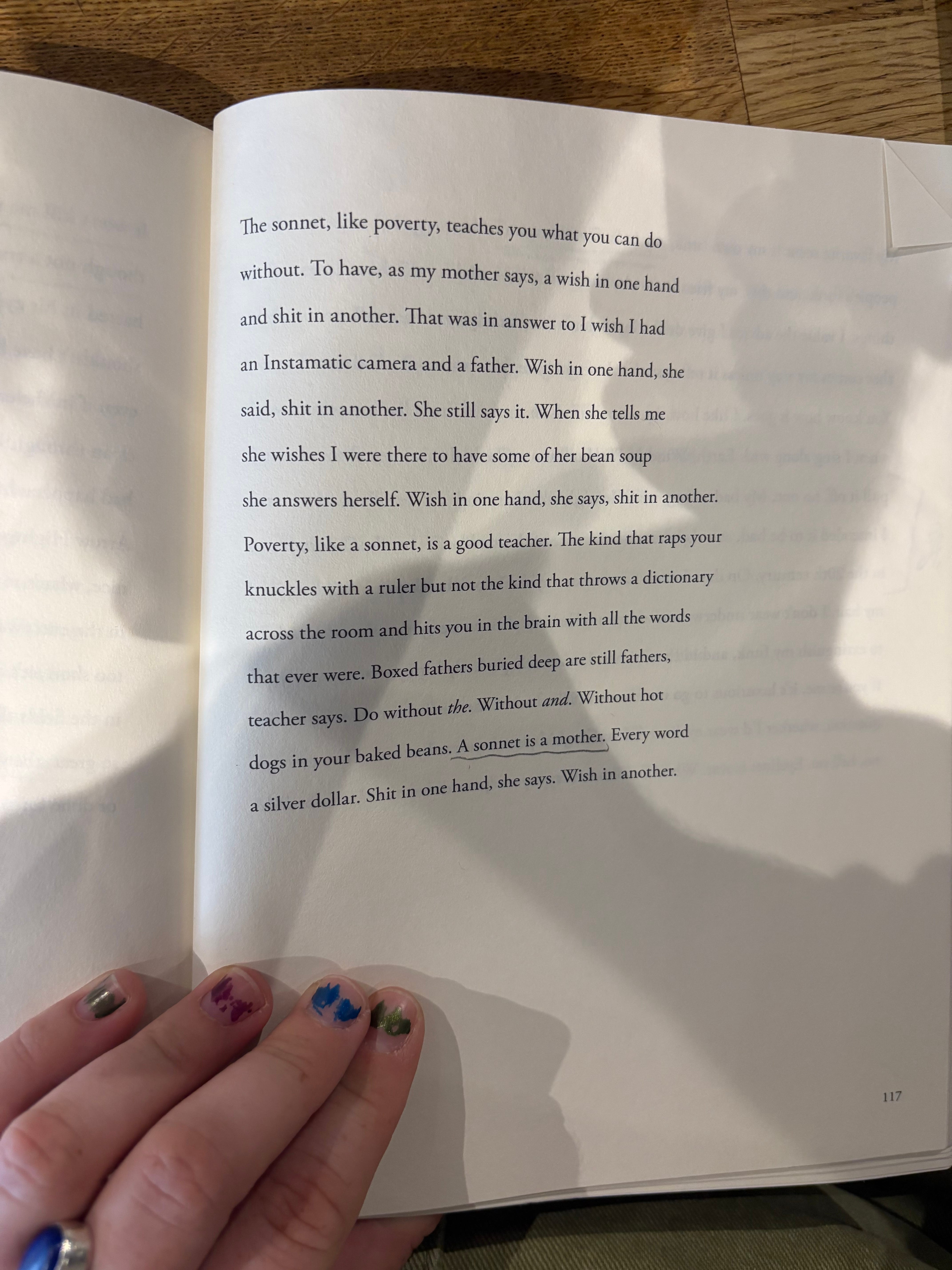 It’s the kind of poem that I am constantly unraveling. Here is the poetry layer, the ars poetica of it all. Then we have the Seussian stark reflection on family ties. The images nail it for me, illustrating so clearly who the speaker's mother is. Then the rhythm of the poem. The sonnet form is beyond meta in this one !!!!! The brutal languaging and the tender. FLA LLA ELA.